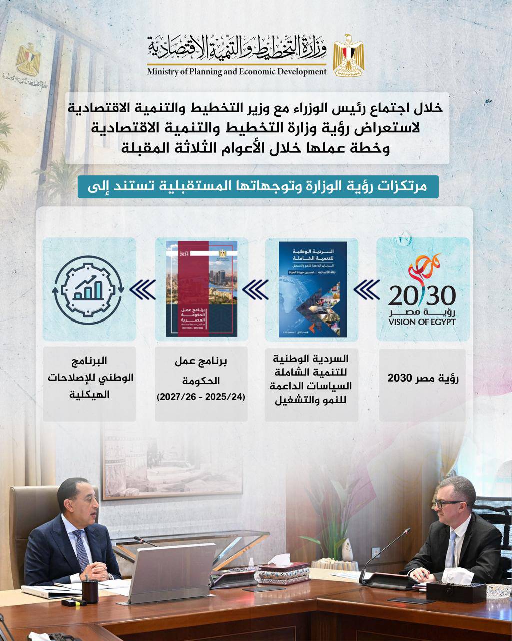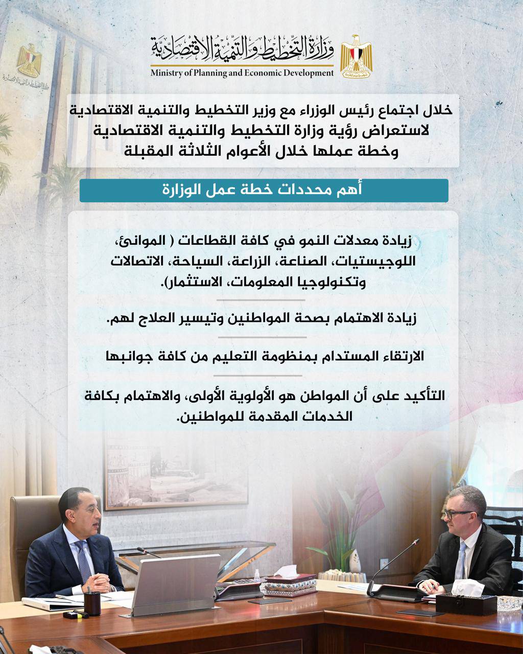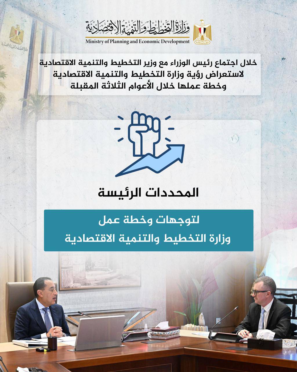 عرض الدكتور أحمد رستم، وزير التخطيط والتنمية الاقتصادية، خلال لقائه مع الدكتور مصطفي مدبولي رئيس مجلس الوزراء؛ رؤية وزارة التخطيط والتنمية الاقتصادية وخطة عملها خلال الأعوام الثلاثة المقبلة.