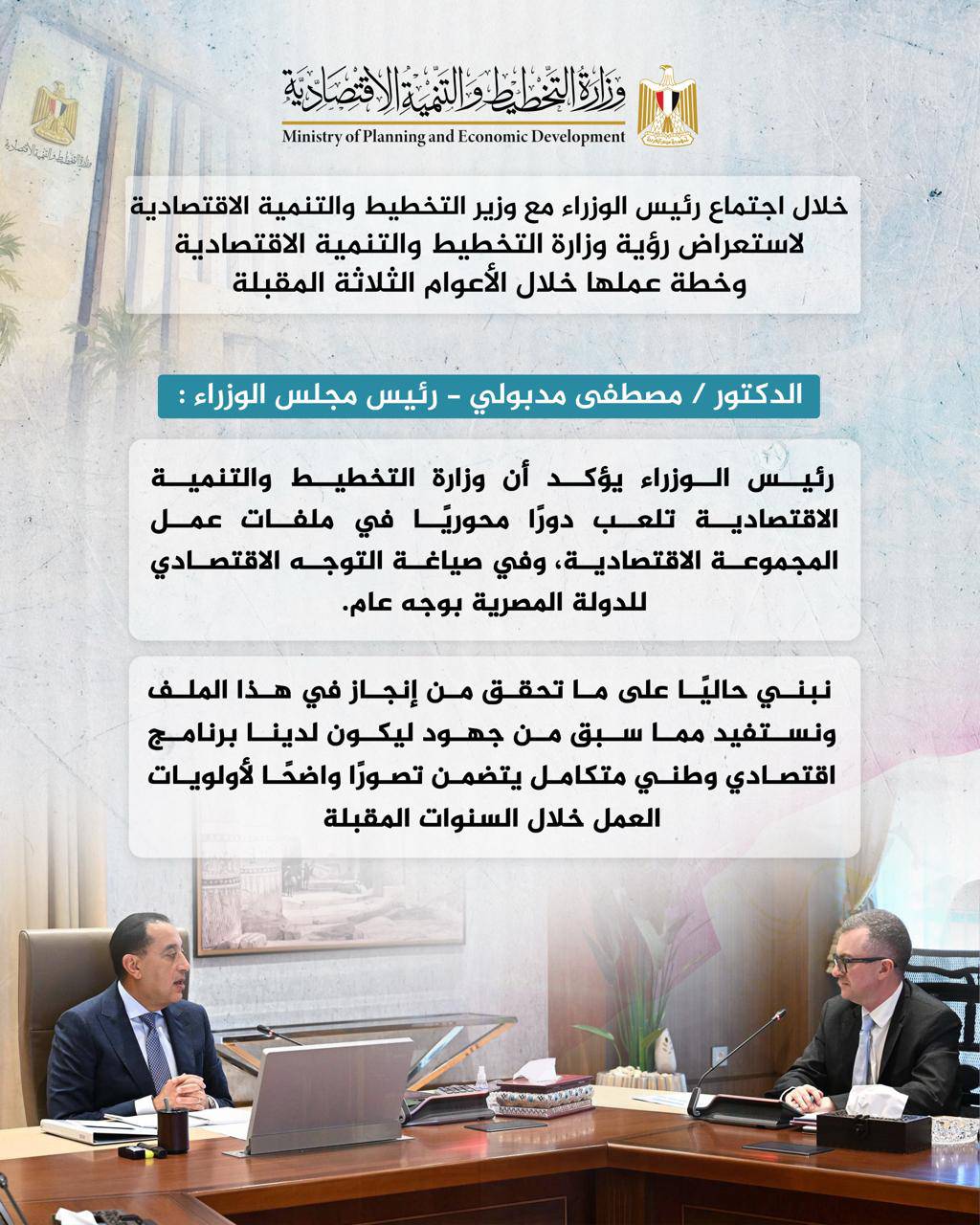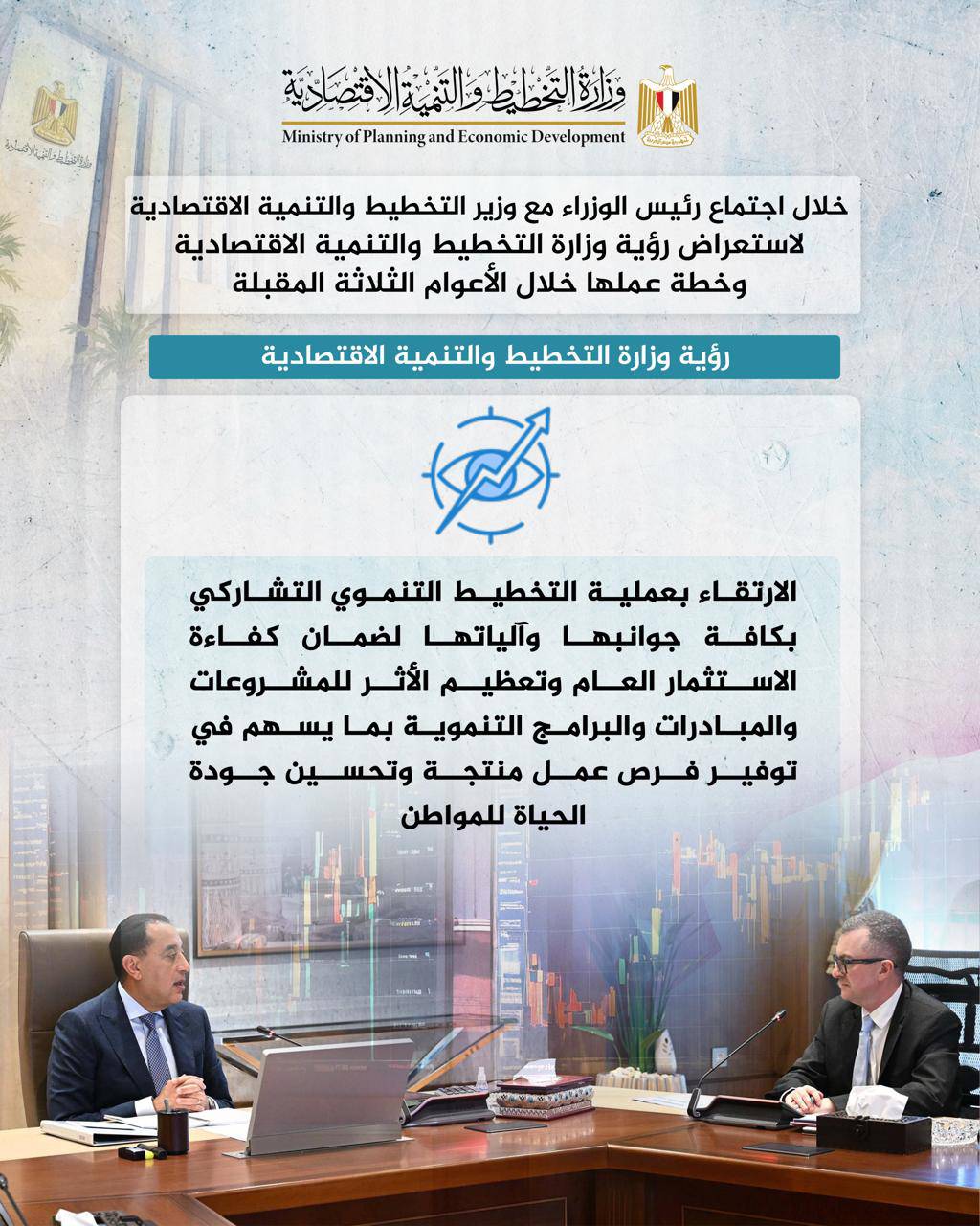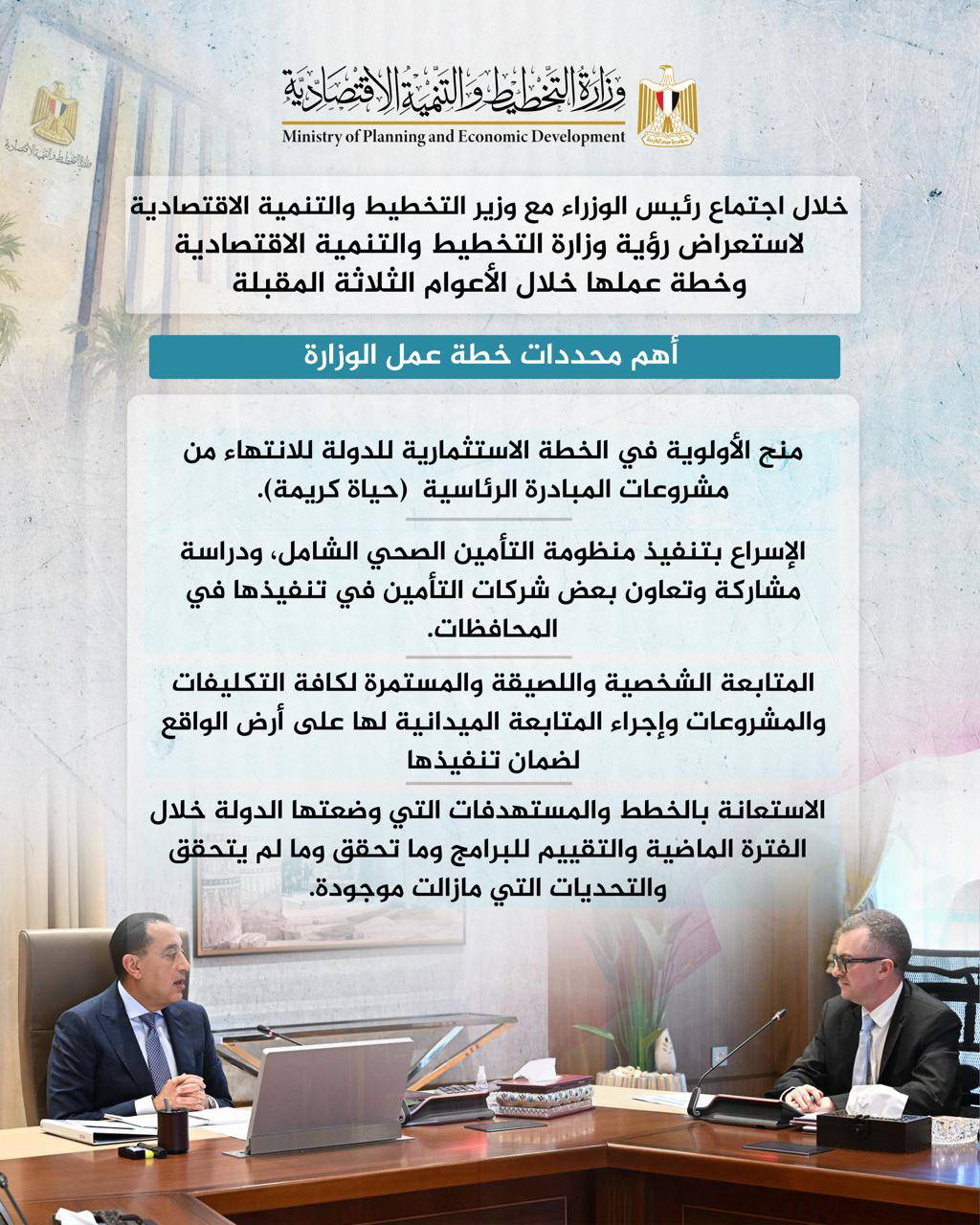 عرض الدكتور أحمد رستم، وزير التخطيط والتنمية الاقتصادية، خلال لقائه مع الدكتور مصطفي مدبولي رئيس مجلس الوزراء؛ رؤية وزارة التخطيط والتنمية الاقتصادية وخطة عملها خلال الأعوام الثلاثة المقبلة.