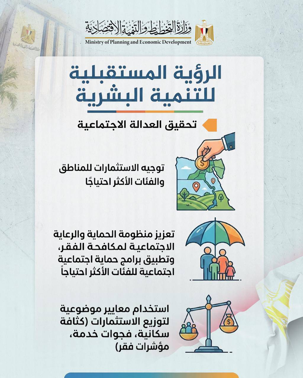 وأكد الدكتور أحمد رستم أن الرؤية المستقبلية في محور التنمية البشرية ترتكز على تحسين جودة حياة المواطن ورفع مستوى المعيشة، وتحقيق العدالة الاجتماعية، عبر عدد من الإجراءات أبرزها: توفير التغطية الكاملة ضمن منظومة التأمين الصحي الشامل، والارتقاء بجودة المنظومة التعليمية، وتطوير البنية التحتية للمنشآت التعليمية (قبل الجامعية والفنية والجامعية)، مع تحفيز البحث العلمي والتكنولوجيا والابتكار وربطه بالمجالات التنموية، فضلاً عن توجيه الاستثمارات للمناطق والفئات الأكثر احتياجاً، وتعزيز منظومة الحماية والرعاية الاجتماعية لمكافحة الفقر، واستخدام معايير موضوعية لتوزيع الاستثمارات منها الكثافة السكانية والفجوات الخدمية ومؤشرات الفقر.